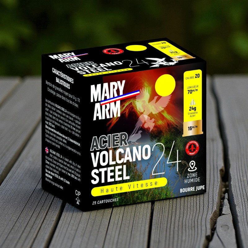 This cartridge completes the VOLCANO series. Its performance, and particularly its velocity, is excellent for shooting fast-moving game. Maximum recommended range: 40 m. No. 4, half choke to cylinder choke. The Volcano range cartridges are the fastest developed by MARY ARM.